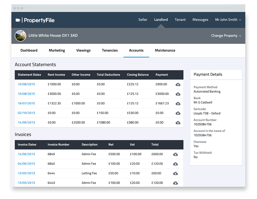 Keep track of income and expenditure on your property in one simple place. Download copies of past statements and invoices.